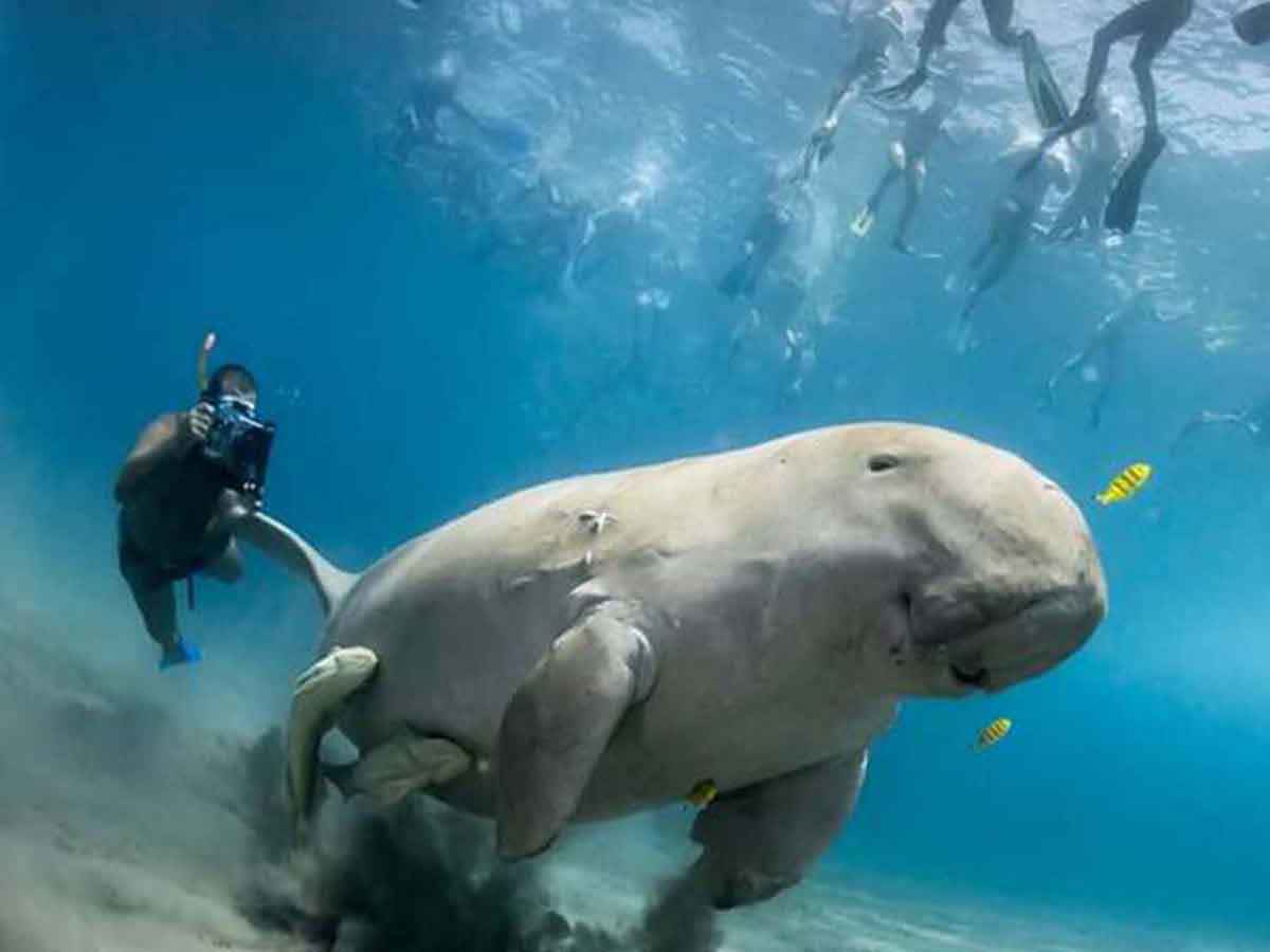 První a nejzajímavější zastávka výletu nabízí možnost plavání s delfíny v oblasti Port Ghalib. V těchto vodách se často vyskytují také mořské želvy a vzácné mořské krávy (dugongové). Setkání probíhá v jejich přirozeném prostředí, bez rušení a s respektem k přírodě.